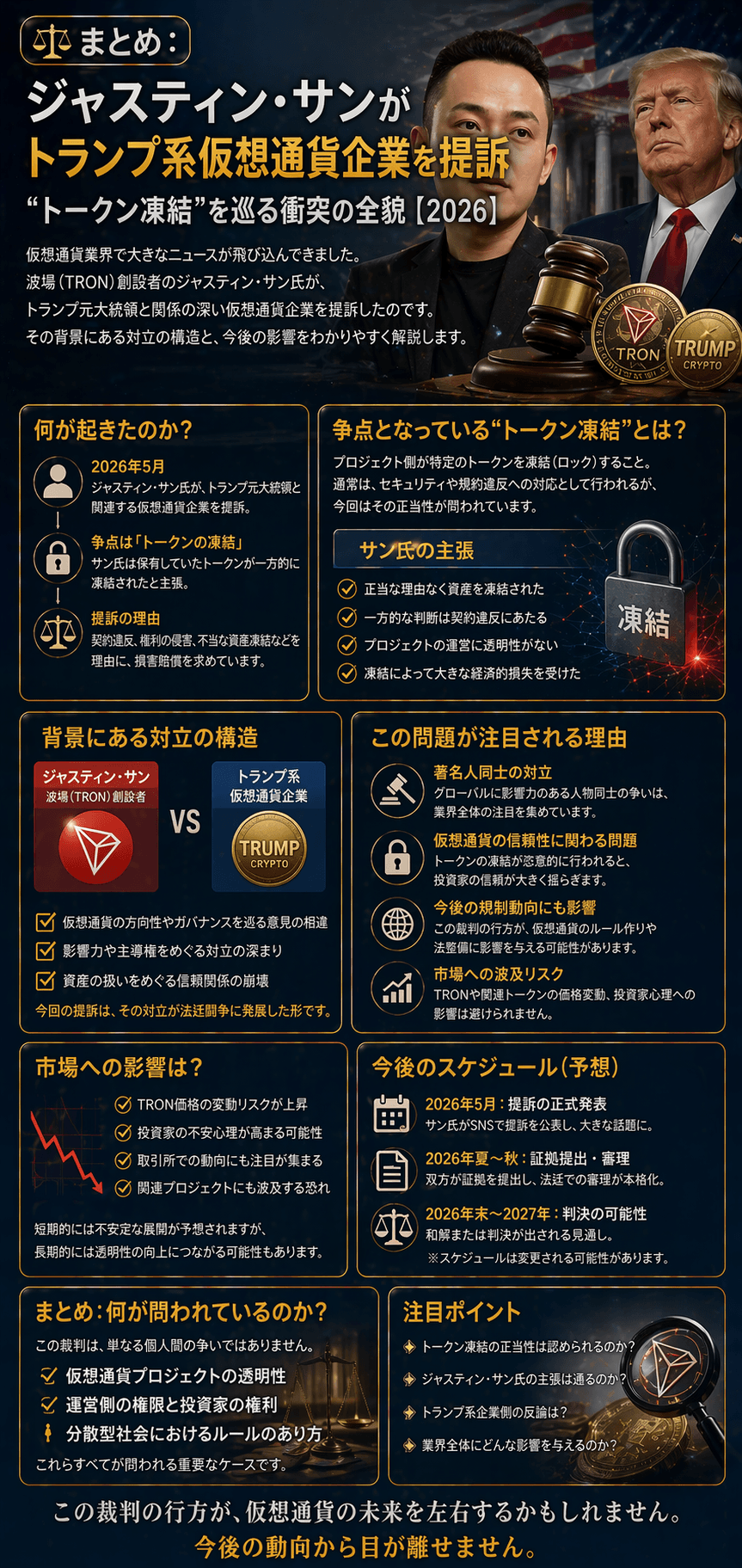 ⚖️まとめ:ジャスティン・サンがトランプ系仮想通貨企業を提訴──“トークン凍結”を巡る衝突の全貌【2026】